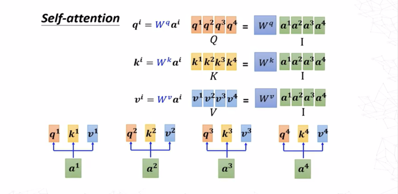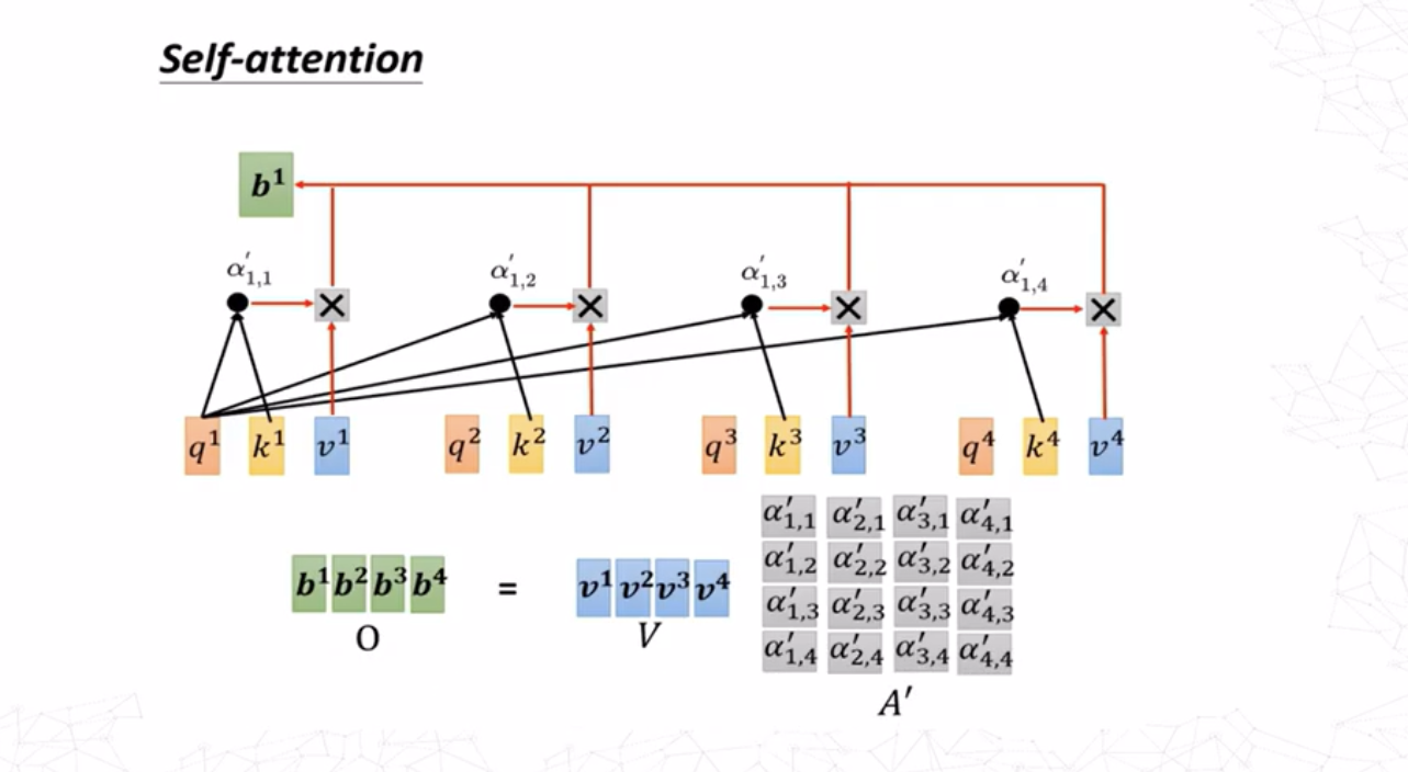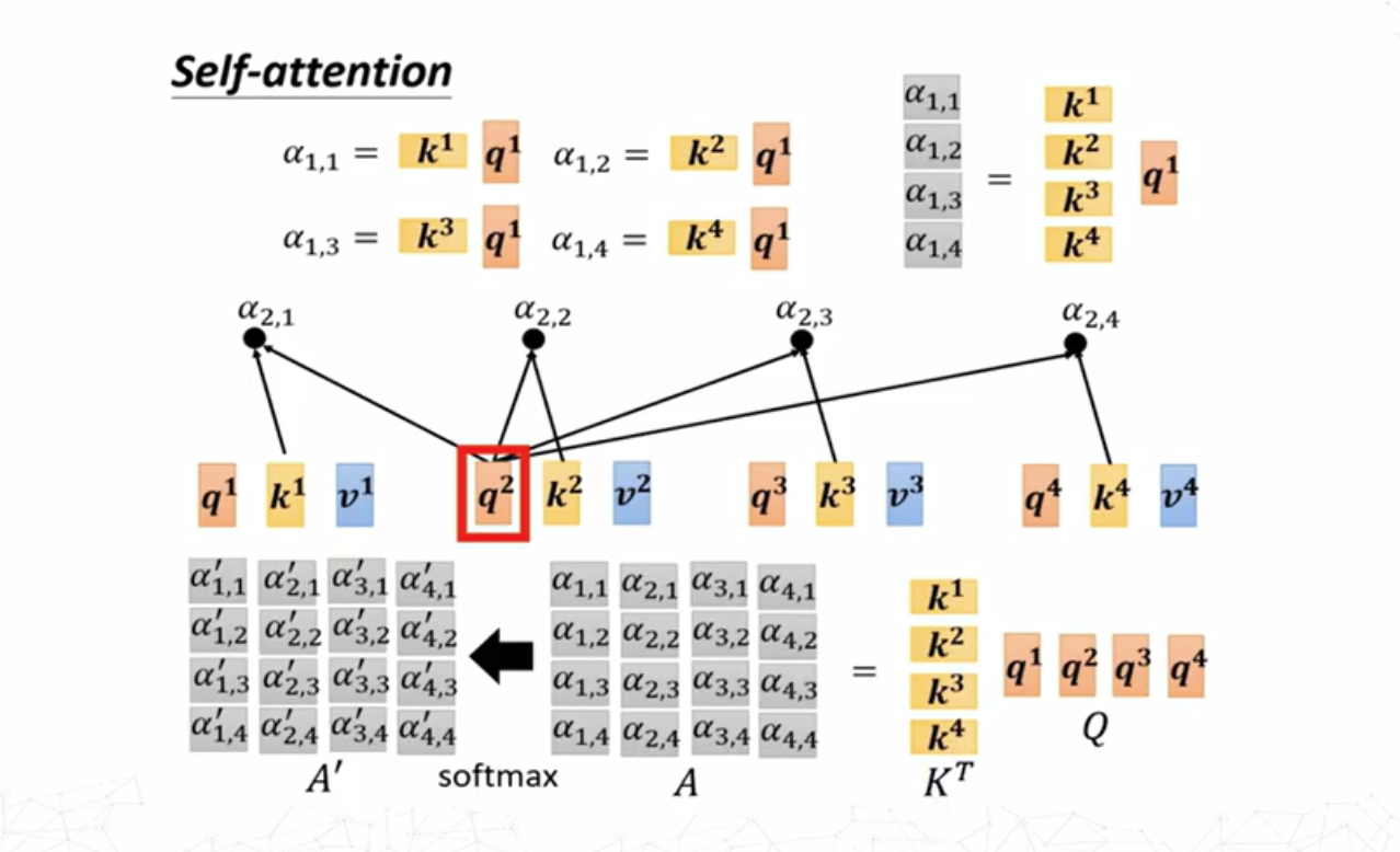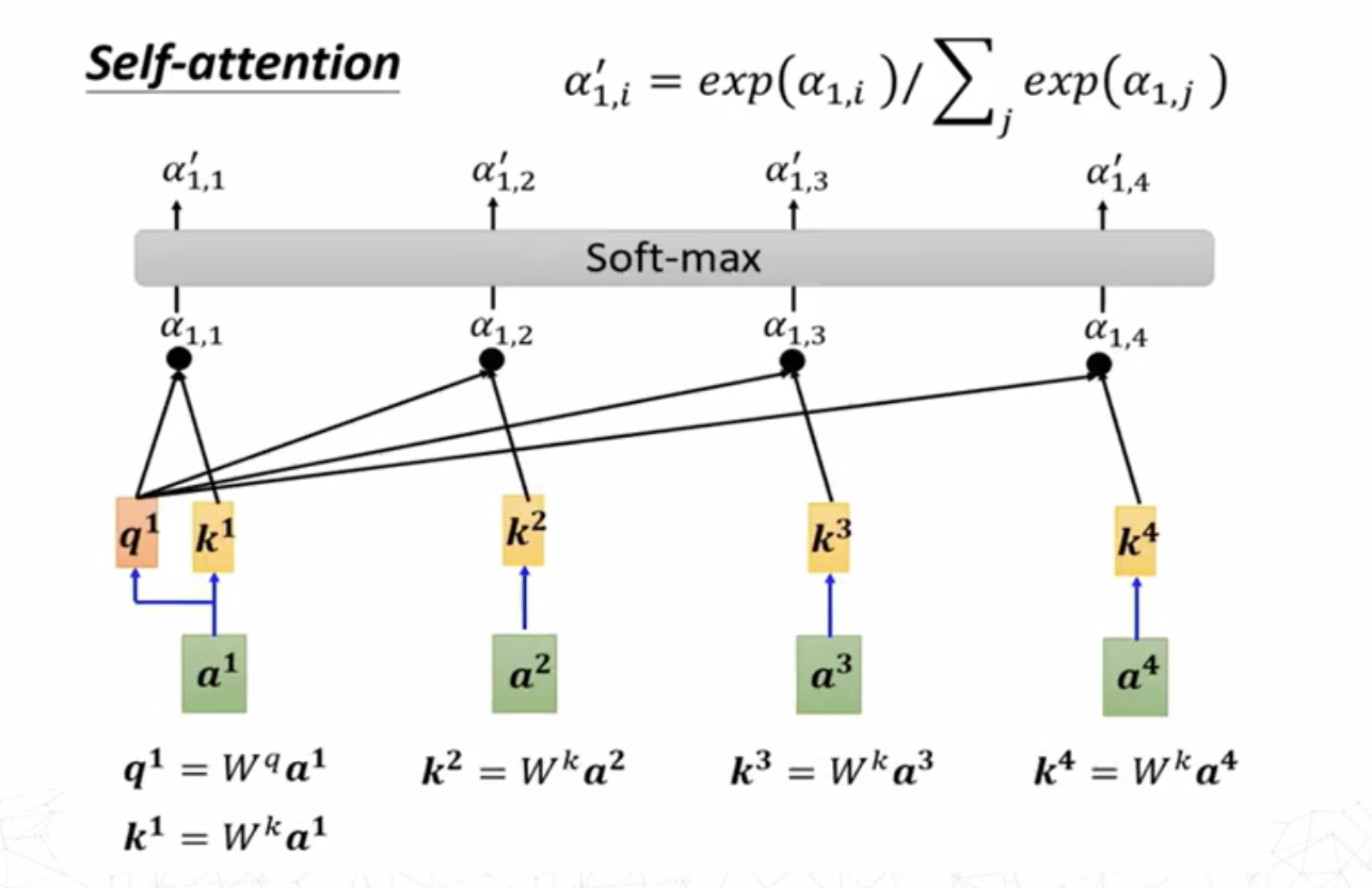对于求\(a^i,a^j\)之间的注意力分数\(\alpha_{i,j}\),最常用的方法是求出\(a^i\)的查询(query)向量 \[ q^i=W^qa^i \] 求出\(a^j\)的键值(key)向量 \[ k^j=W^ka^j \] 则注意力分数为查询向量和键值向量的点积 \[ \alpha_{i,j}=q^i\cdot k^j \]