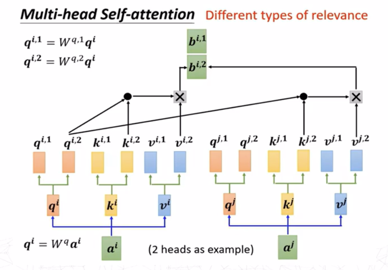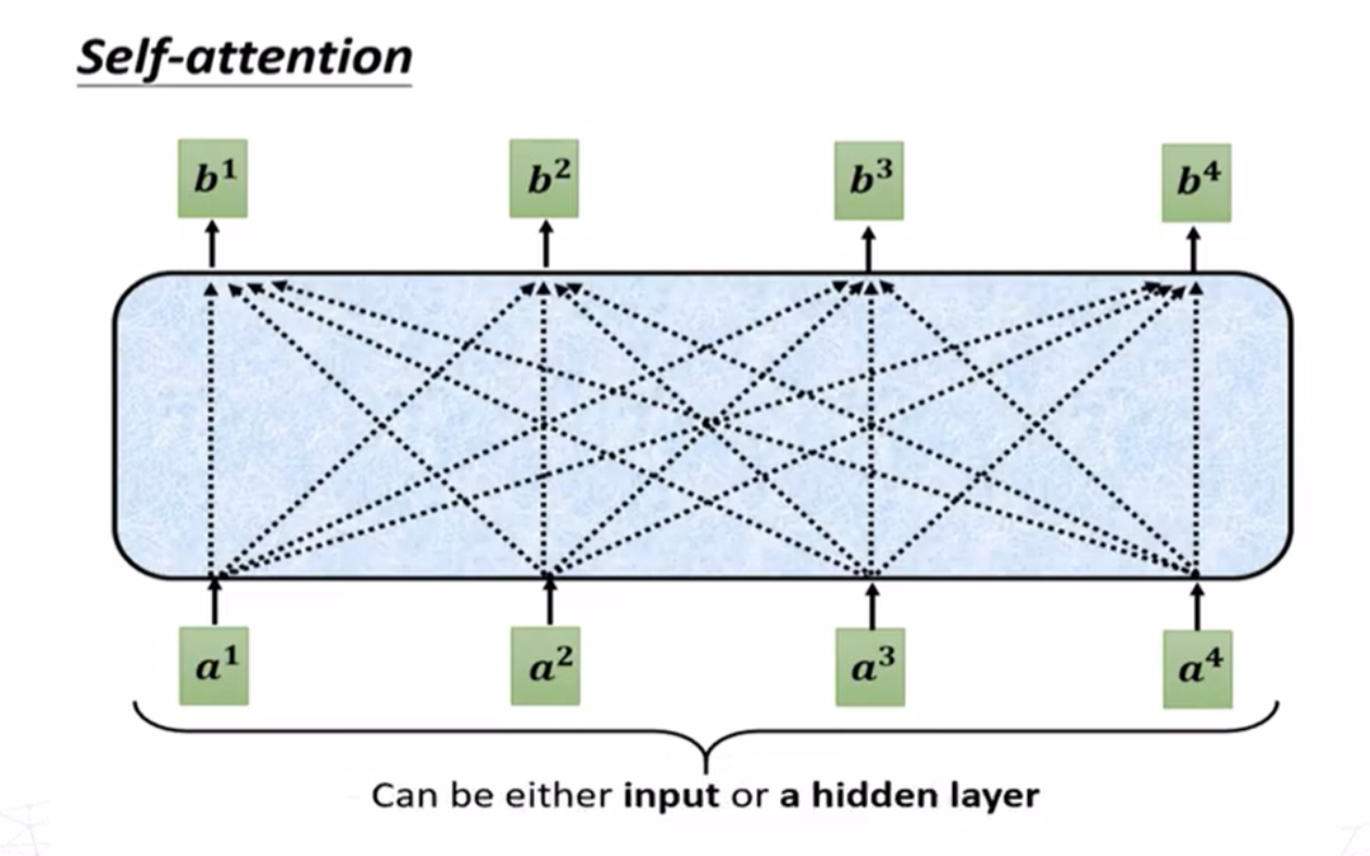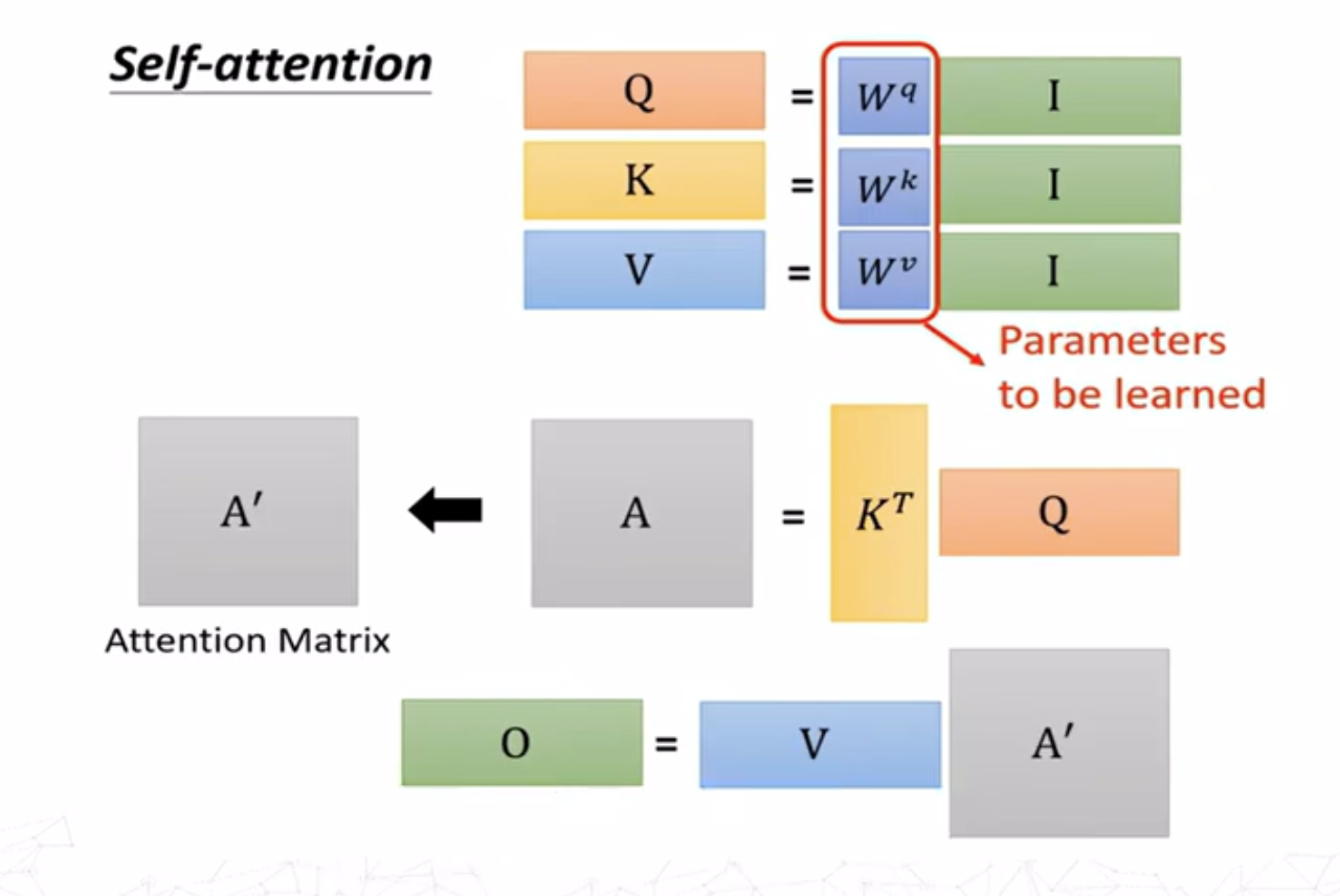 对于求\(a^i,a^j\)之间的注意力分数\(\alpha_{i,j}\),最常用的方法是求出\(a^i\)的查询(query)向量 \[ q^i=W^qa^i \] 求出\(a^j\)的键值(key)向量 \[ k^j=W^ka^j \] 则注意力分数为查询向量和键值向量的点积 \[ \alpha_{i,j}=q^i\cdot k^j \]
