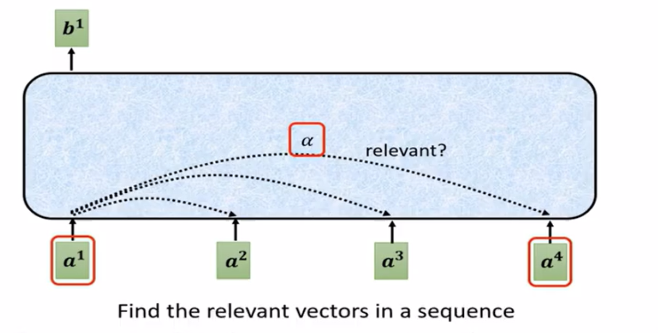 如图,\(a^i\)是不含上下文信息的词嵌入(这里以NLP的过程为例,事实上注意力机制还可以用于图像处理等,\(a^i\)可为初始输入或来自某个模型的输出),输出的结果\(b^i\)与所有词嵌入都有关。当我们了解\(b^1\)向量如何产生之后,其余向量的产生过程都可以很容易得到。产生\(b^1\)向量的首要步骤是找到\(a^1\)与其他向量的关联程度(也称注意力分数)。
