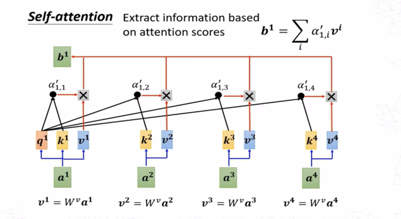 得到\(a^1\)与自身及其他几个嵌入向量的注意力分数之后,将这些分数与其对应向量的值向量相乘然后求和,即可得到添加了上下文信息的嵌入\(b^1\)。值向量可通过下式求得: \[ v^i=W^va^i \]